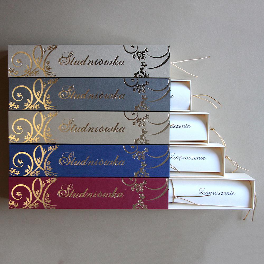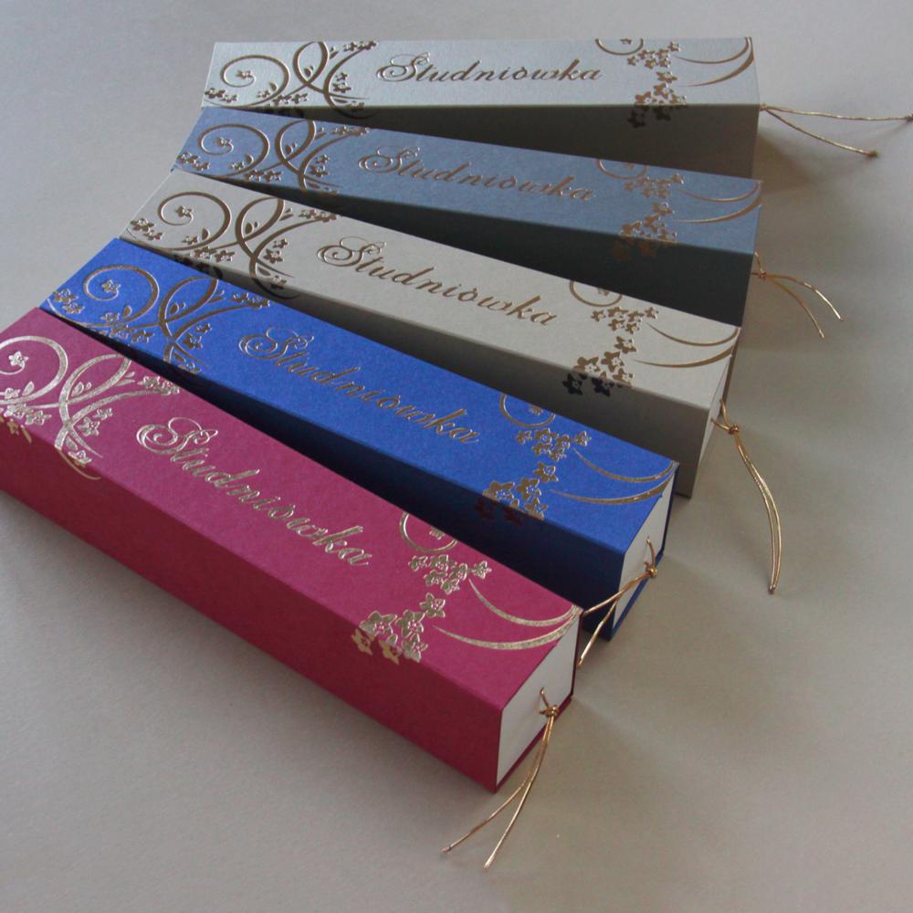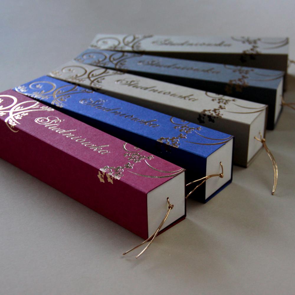 Wykonane z kartonu perłowego w kolorach: granatowym, starym złotcie i grafitowym, oraz z satynowego gładkiego kartonu w kolorze bordowym, cappuccino i czarnym.