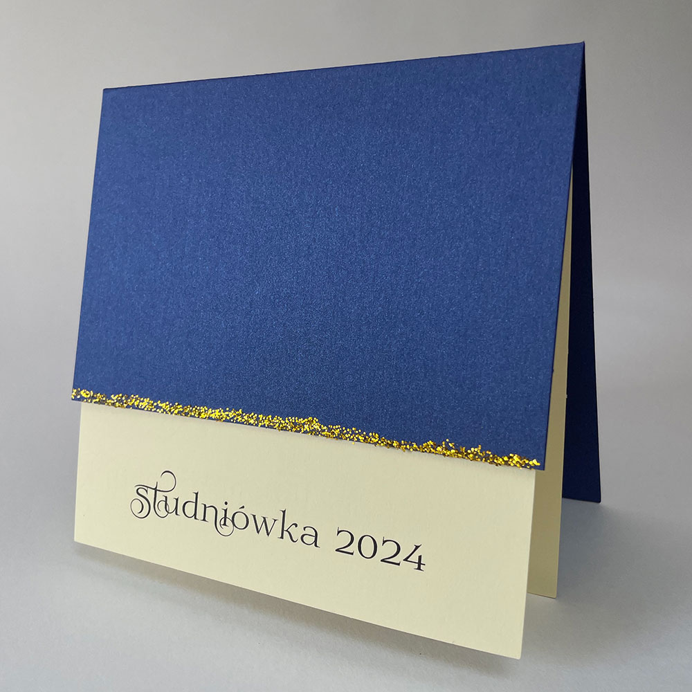 Zaproszenie wykonane z perłowego kartonu w kolorze granatowym.