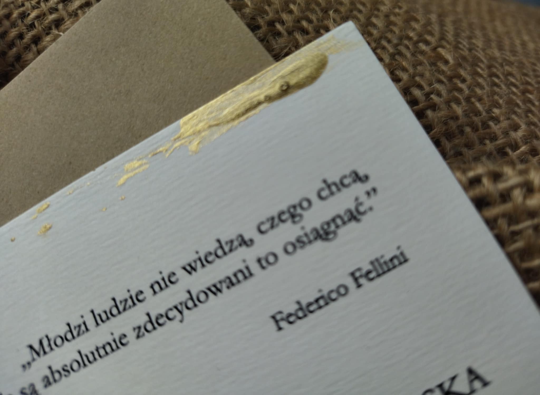 Rustykalne zaproszenie wykonane z matowego kartonu w kolorze śmietankowym. Ozdobione złotą perłową farbką nakładaną ręcznie co stwarza niepowtarzalność. Format 12,0 x 17,0 cm W komplecie koperta Eco.